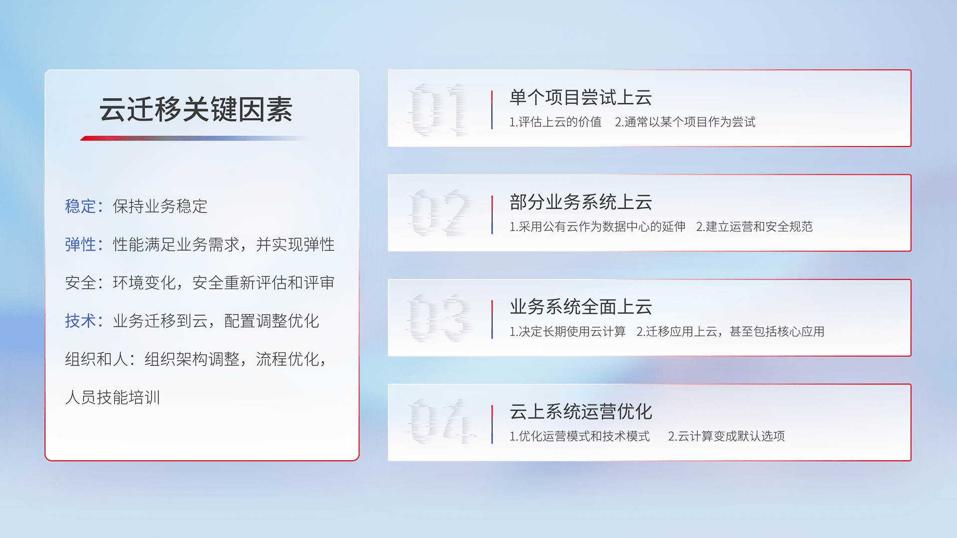 结合实际业务,,,从规划设计、、、、云平台选型、、、云原生改造、、数据迁移、、、、集成交付,,,,迁移全过程为客户识别最佳上云路径,,,做好风险识别管理,,设计网络架构、、身份权限、、、、安全审计合规、、、操作审计、、、日志审计、、、、监控告警策略、、、、多站点容灾设计等,,,对云上基础设施进行整体规划,,,提升IT治理水平,,以满足弹性、、高可用、、高性能的需求。。
