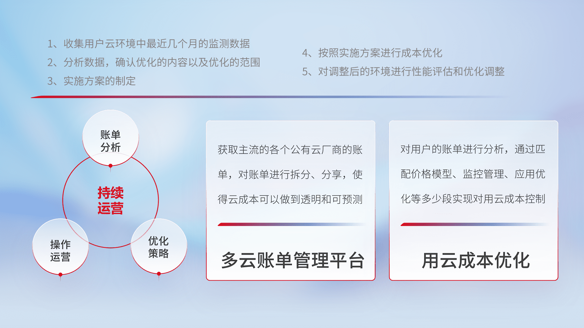 通过多云纳管,,,,以统一的资源数据模型把客户的云资源进行抽象和封装,,,进而实现对多云资源的统一操作,,,保障云资源管理的可靠性、、、、稳定性与可用性。。。。量身定制化运维内容,,,配置、、、开发运维、、、补丁管理、、、备份、、、监控、、、认证和访问管理、、审计和日常巡检等,,保障在用云过程中的可靠度,,,稳定度以及高可用率。。